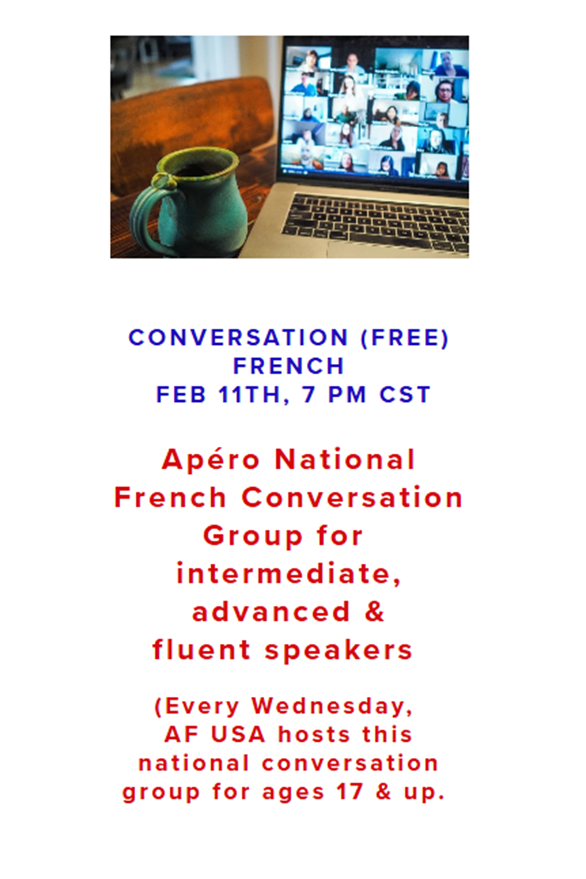 Members of Alliance Française d'Oklahoma City have access to a wide variety of online Alliance Française events from across the globe. Most of these events are held over Zoom.